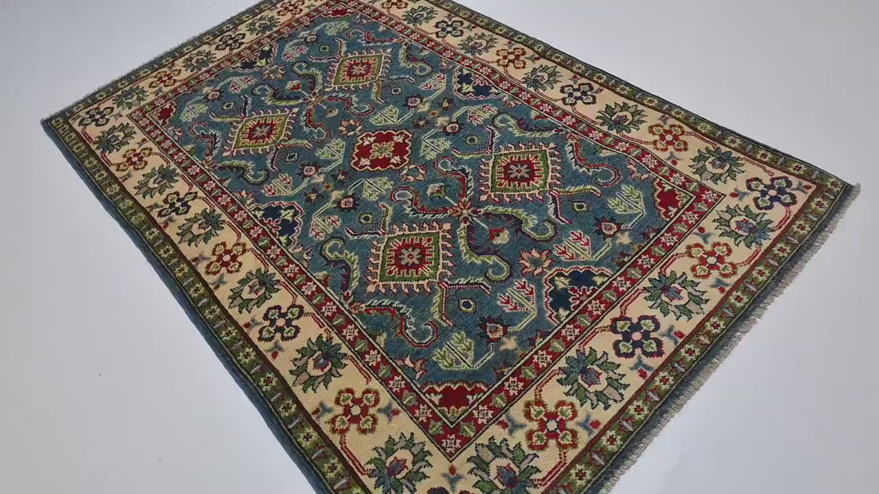This is not just a rug—it is a statement of refinement. With its serene muted blue palette, fine Kazak design, and authentic Afghan heritage, this 4x6 masterpiece will enrich your home with warmth, elegance, and timeless cultural beauty.